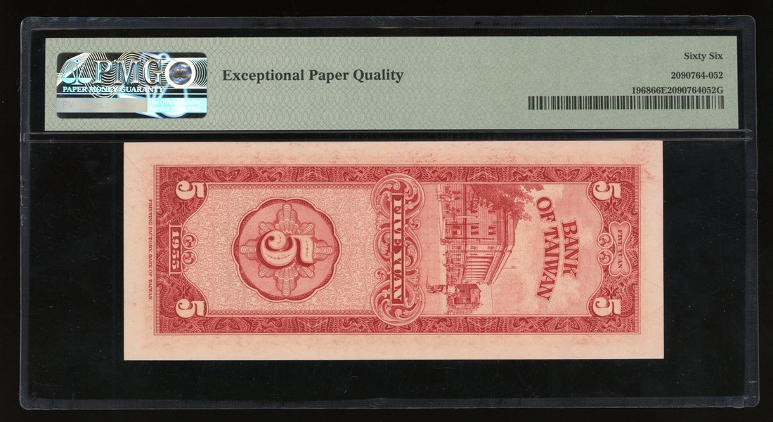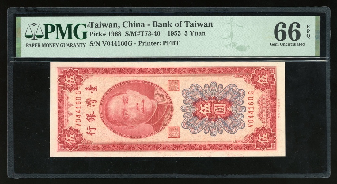 Bank of Taiwan, a consecutive group of 5x 5 yuan, Year 44(1955), serial numbers V044156G-160G, (Pick 1968), all graded PMG 66EPQ Gem Uncirculated (5).