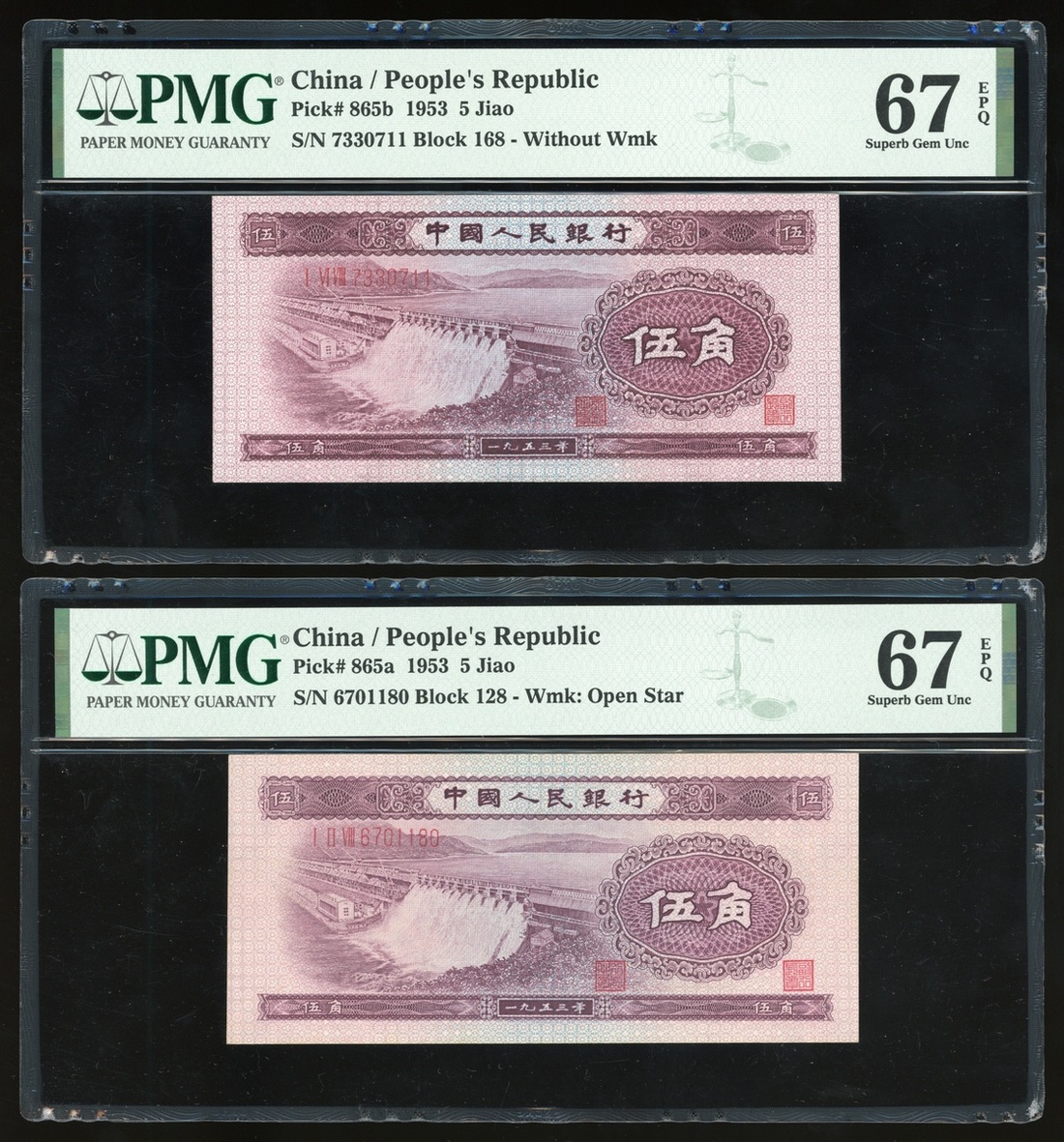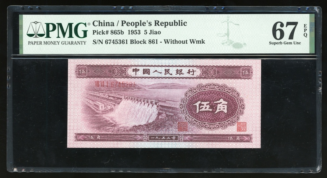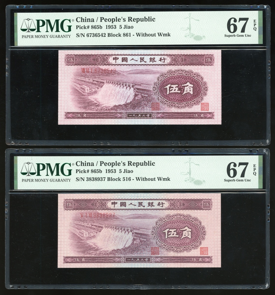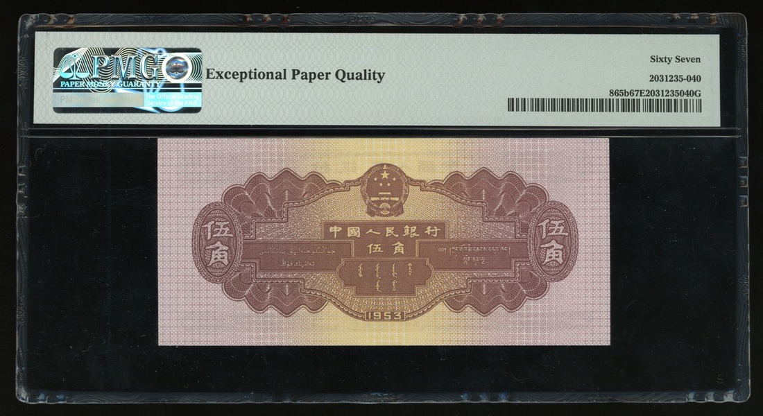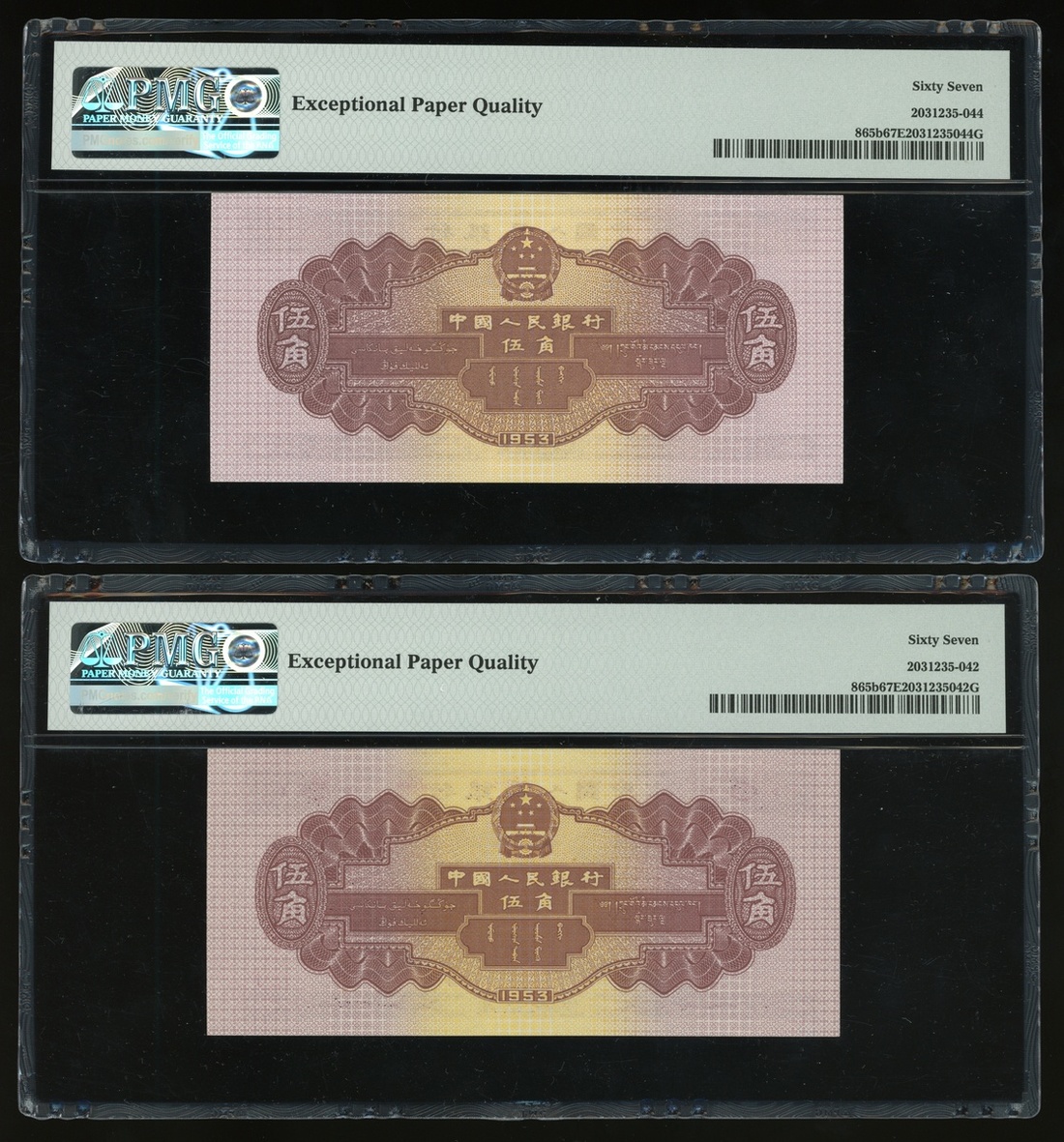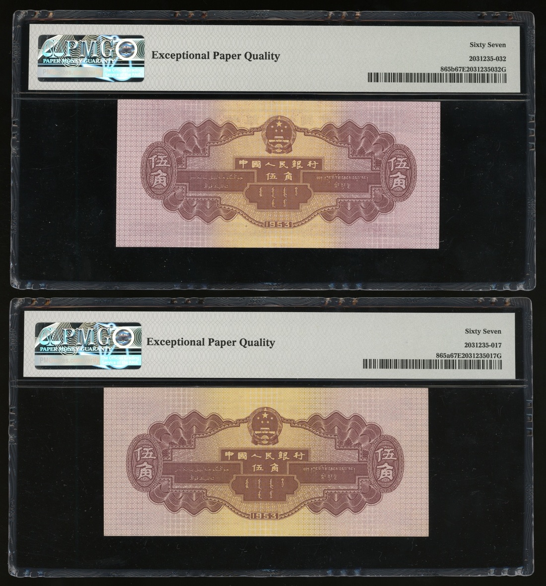 1953年中國人民銀行第二版人民幣伍角一組5枚,均無水印,均PMG 67EPQ