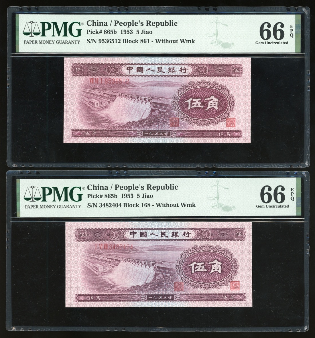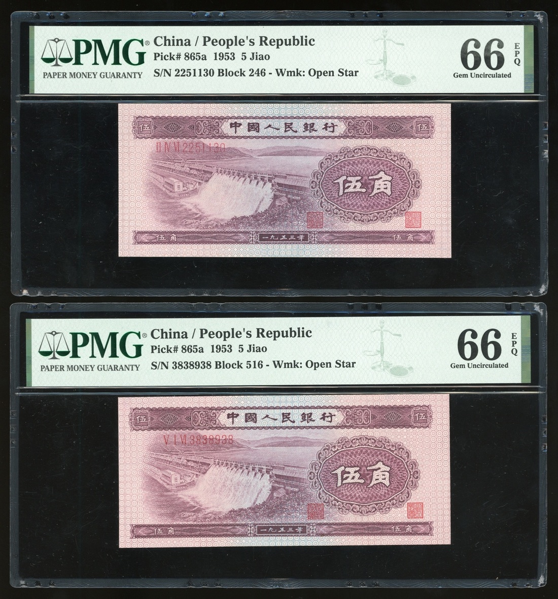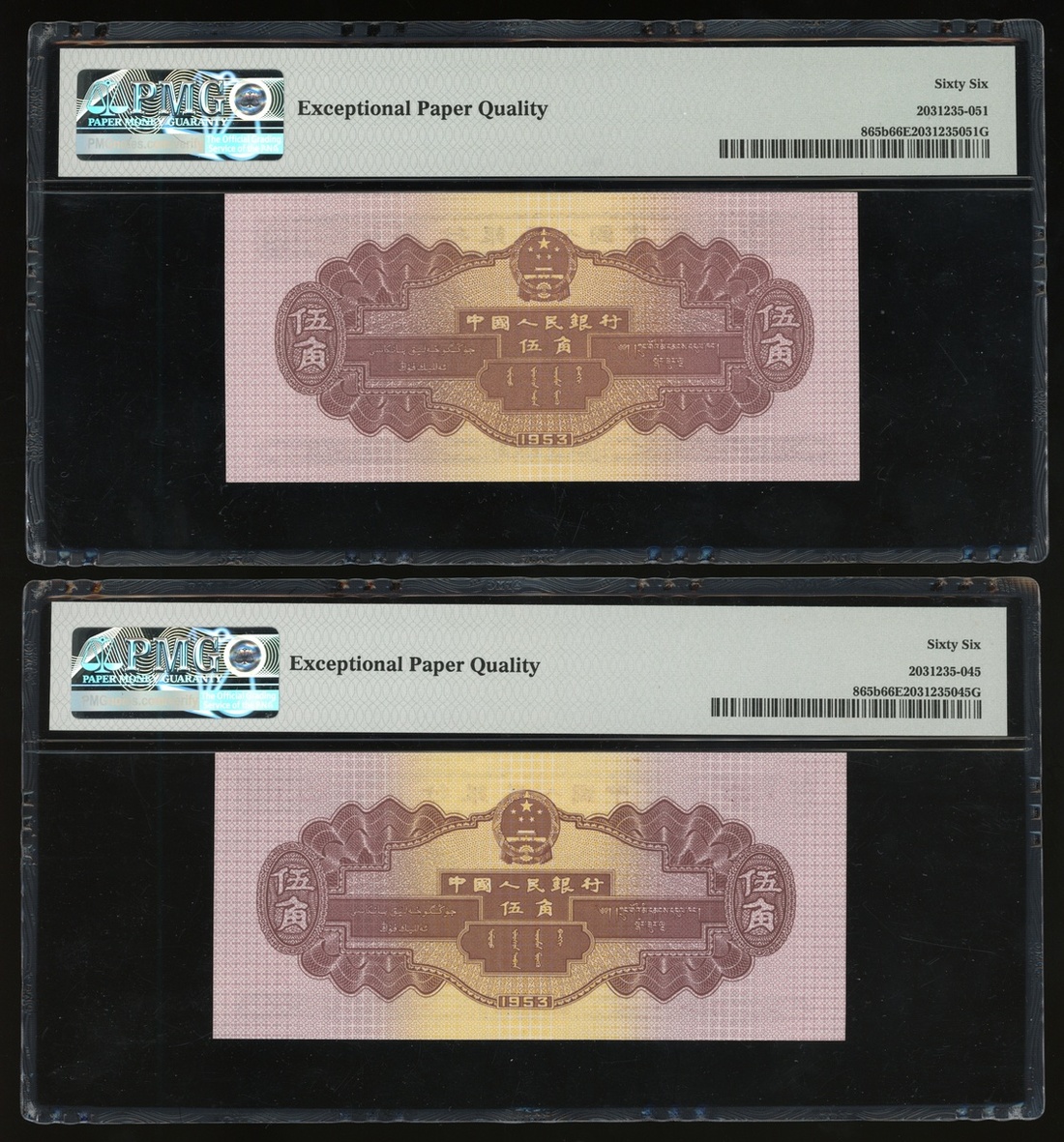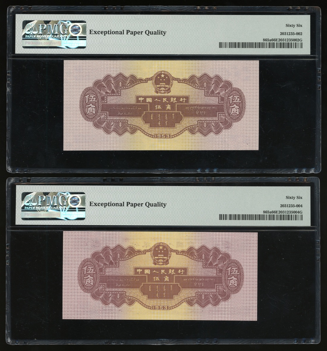 1953年中國人民銀行第二版人民幣伍角一組4枚,編號II IV VI 2251130, V I VI 3838939, VIII VI I 9536512 及 I VI VIII 3482404,2枚星水印,均PMG 66EPQ