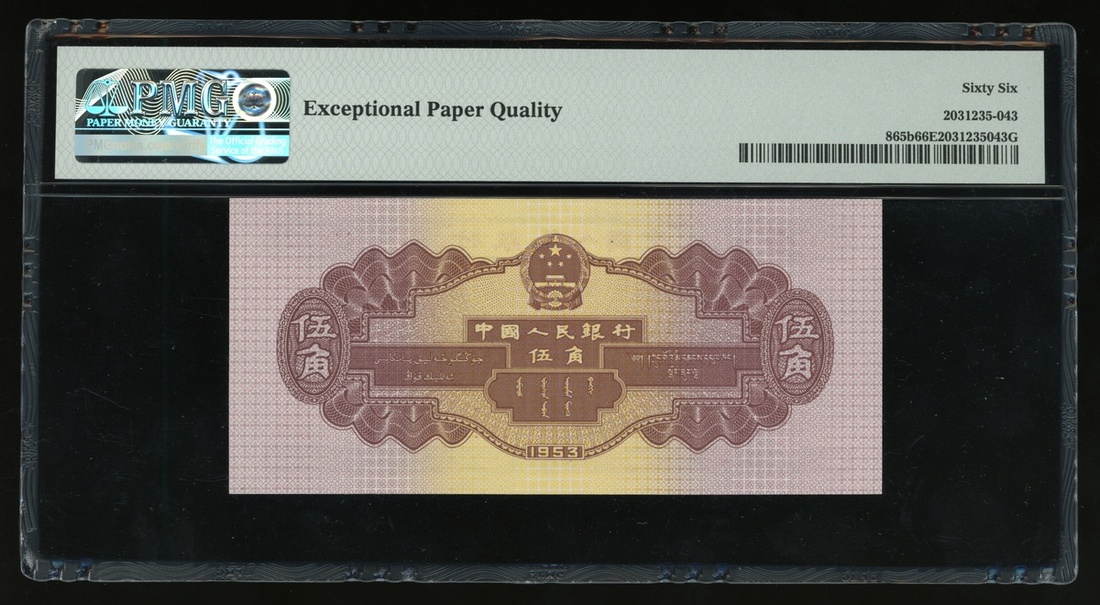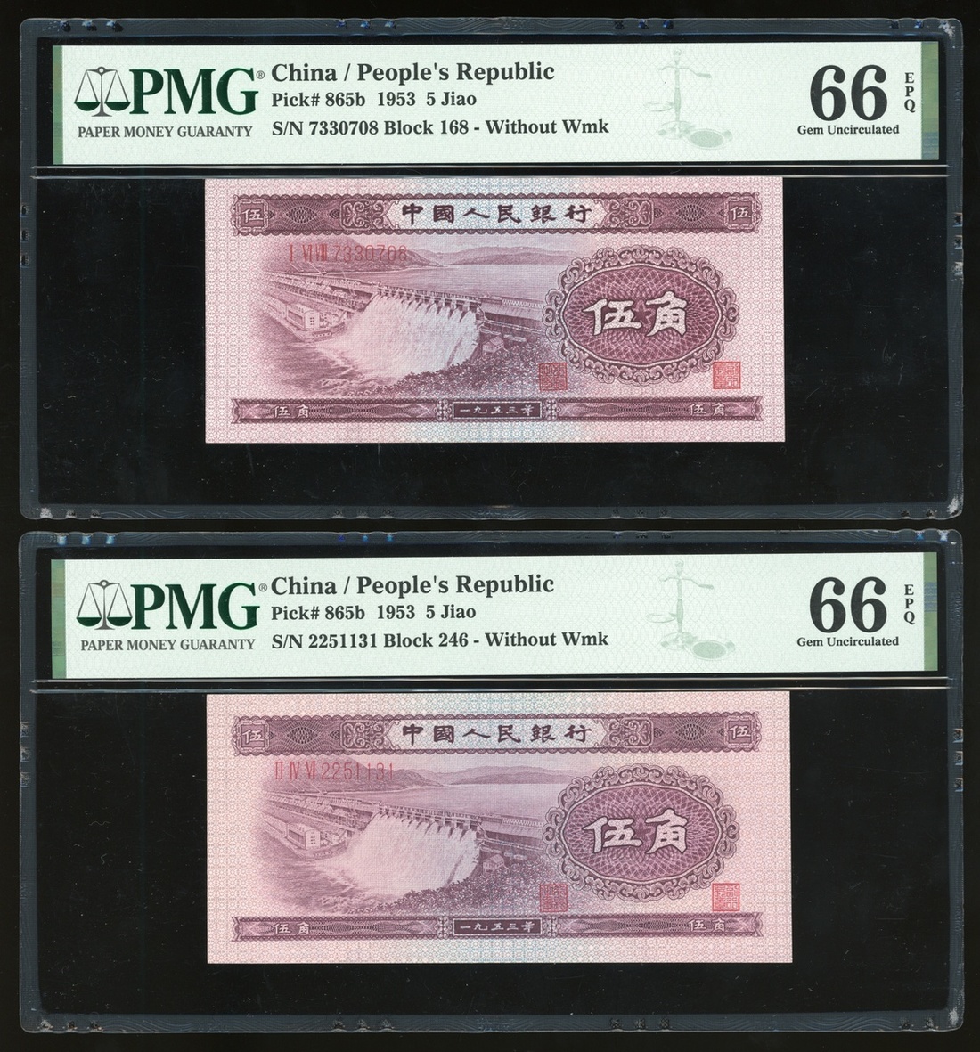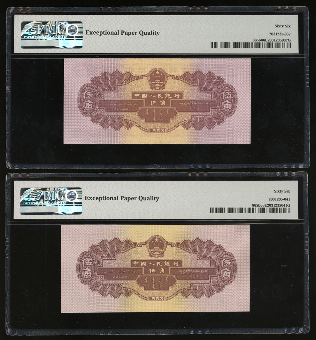 1953年中國人民銀行第二版人民幣伍角一組3枚,編號I VI VIII 7330708, II IV VI 2251131 及 I VI VIII 3477421,均無水印,均PMG 66EPQ