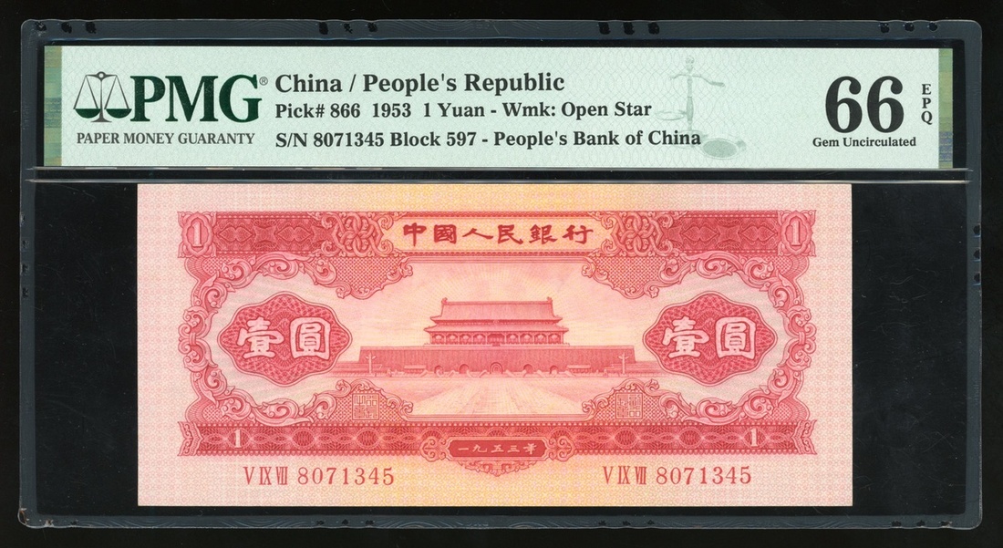 People's Bank of China, 2nd series renminbi, 1953, 1 yuan, red, serial number V IX VII 8071345, (Pick 866), PMG 66EPQ Gem Uncirculated. Scarce in high grade