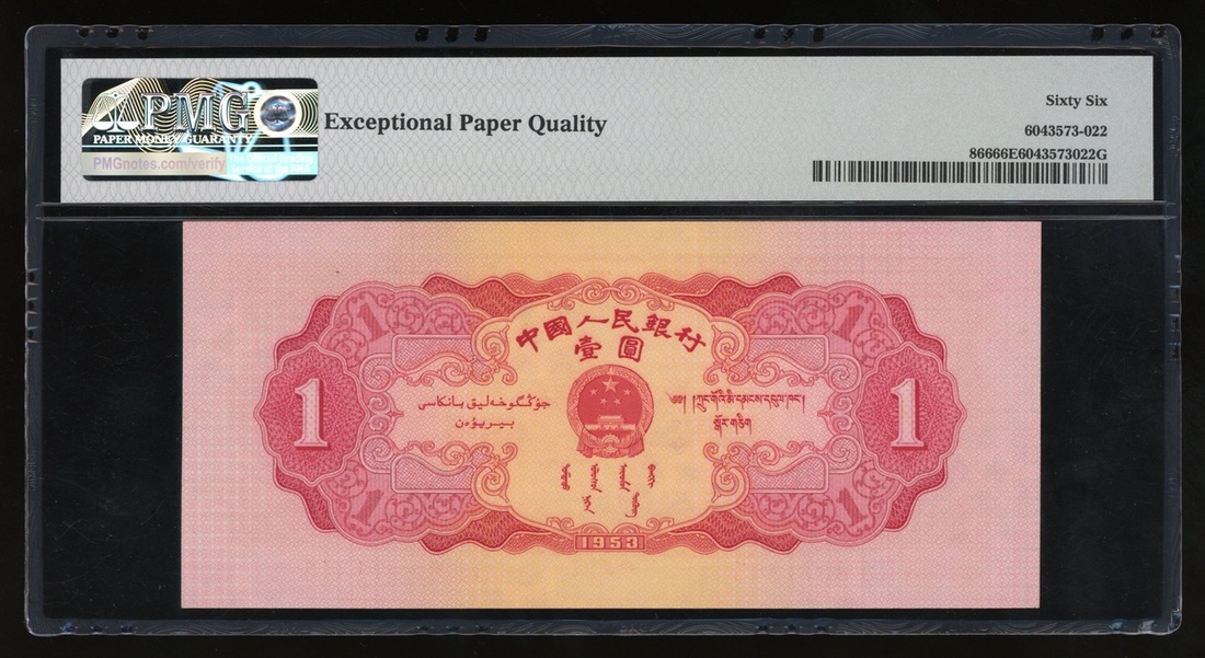 1953年中國人民銀行第二版人民幣壹圓,紅色,編號V IX VII 8071345,PMG 66EPQ,罕見高分