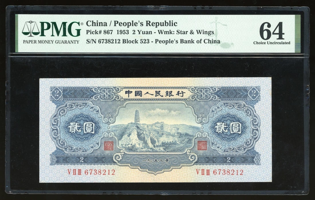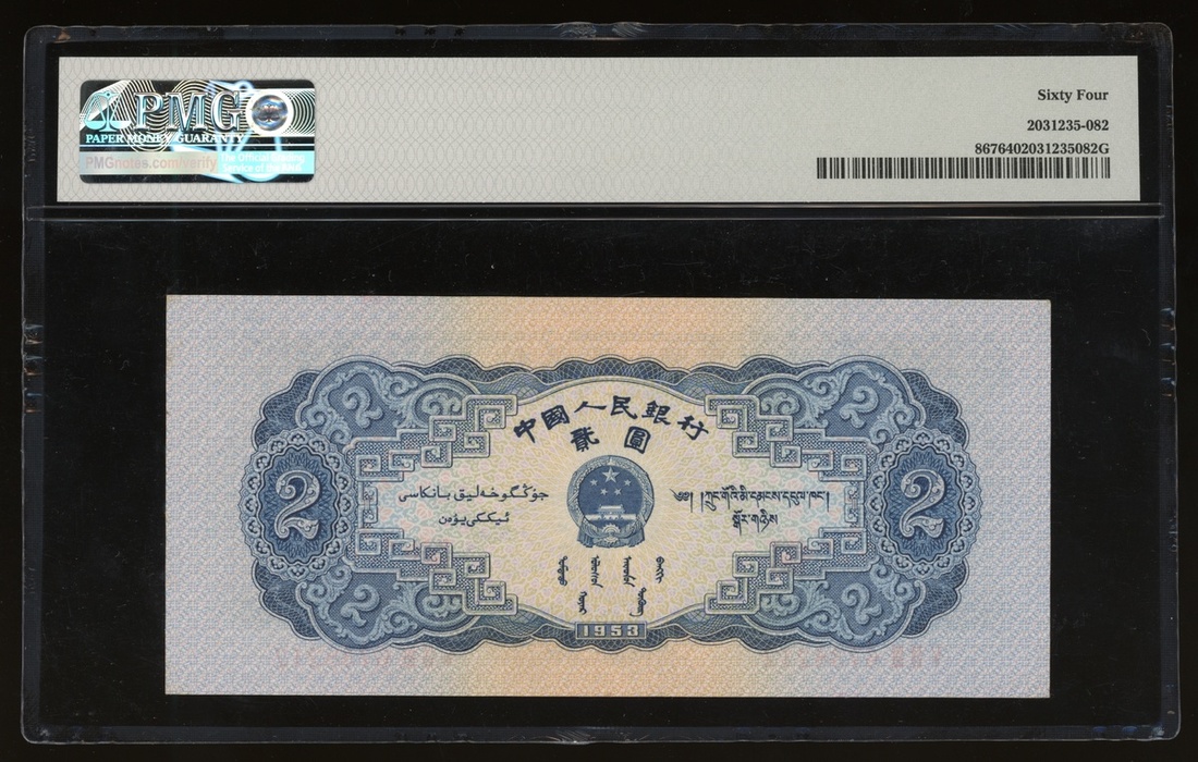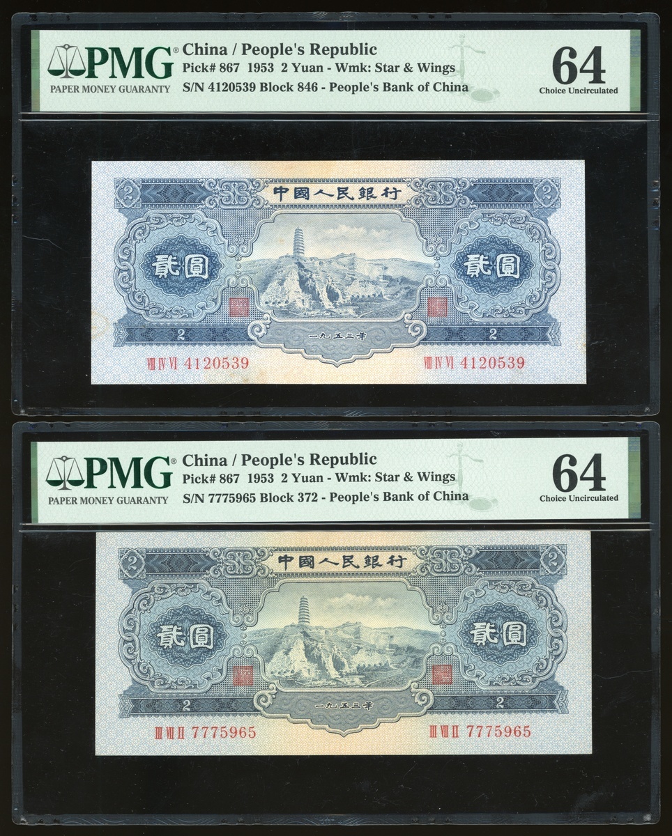 People's Bank of China, 2nd series renminbi, 1953, a group of 3x 2 yuan, serial numbers VIII IV VI 4120539, III VII II 7775965 and V II III 6738212, (Pick 867), all graded PMG 64 Choice Uncirculated (3).