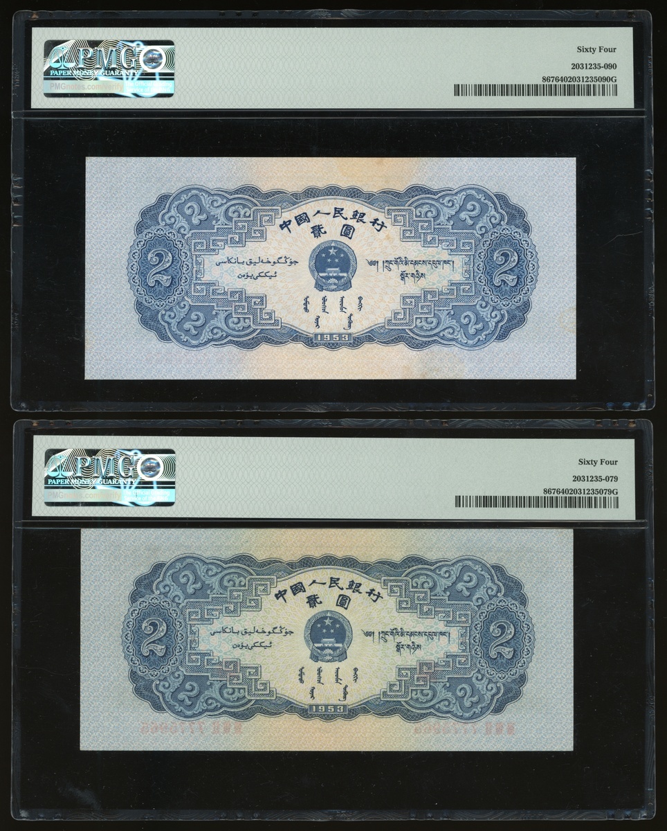 1953年中國人民銀行第二版人民幣貳圓一組3枚,編號VIII IV VI 4120539, III VII II 7775965 及V II III 6738212,均PMG 64