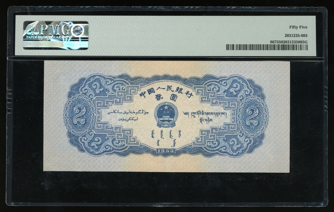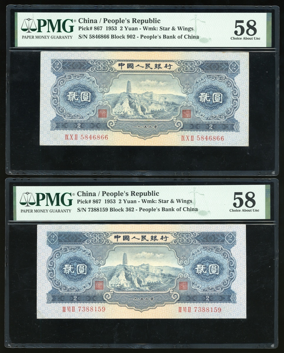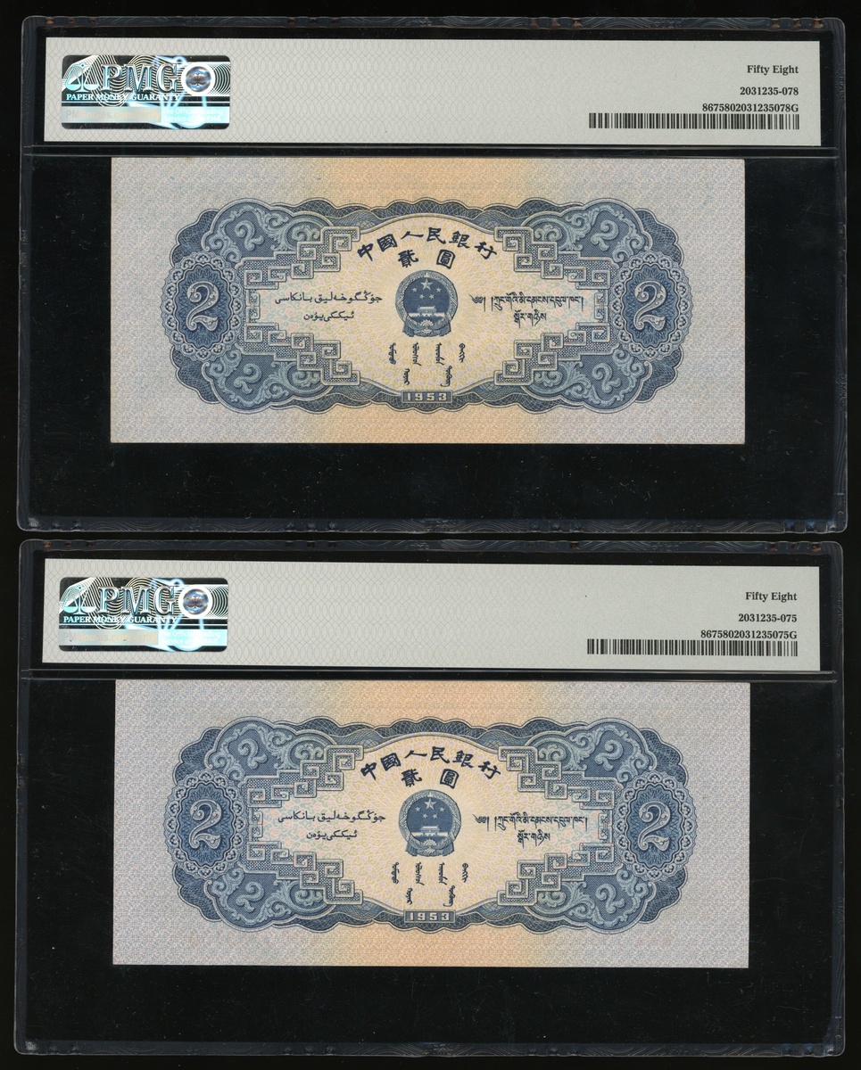 1953年中國人民銀行第二版人民幣貳圓一組3枚,編號IX X II 5846866, III VI II 7388159 及 I IV II 8430671,分別評PMG 58,58及55