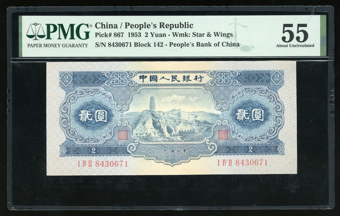 People's Bank of China, 2nd series renminbi, 1953, a group of 3x 2 yuan, serial numbers IX X II 5846866, III VI II 7388159 and I IV II 8430671 (Pick 867), graded PMG 58, 58 and 55 respectively (3)