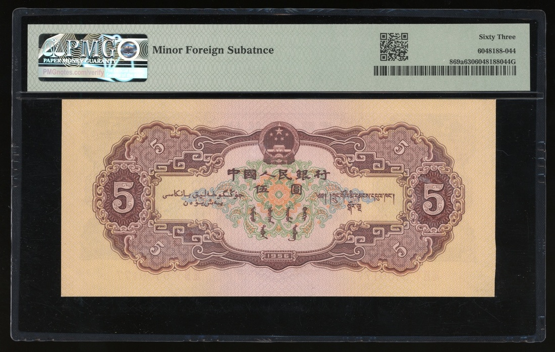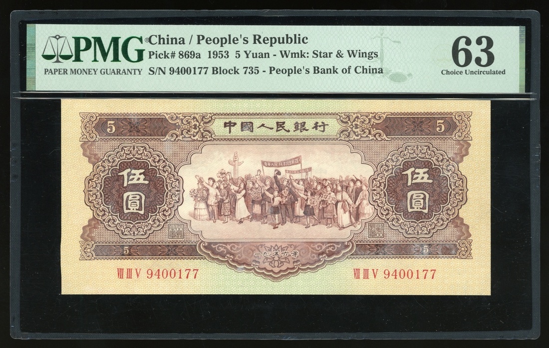 1953年中國人民銀行第二版人民幣伍圓,星及翼水印,編號 VII III V 9400177,PMG 63,輕微外附物
