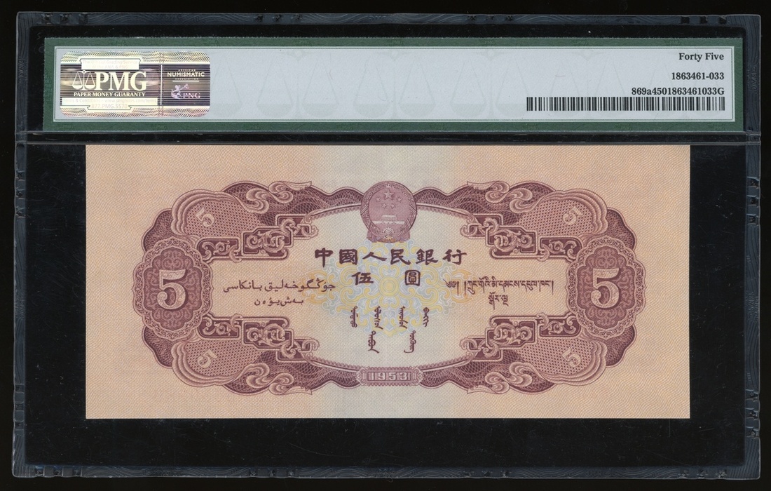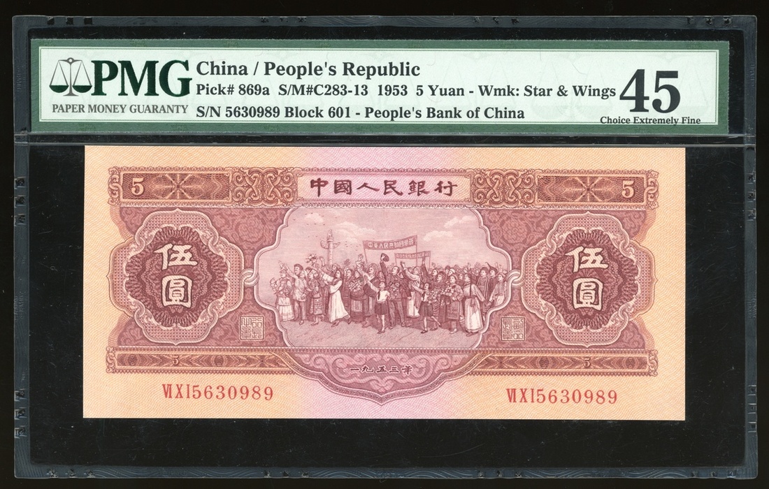 People's Bank of China, 2nd series renminbi, 1953, 5 yuan, serial number VI X I 5630989, star and wings watermark, (Pick 869a), PMG 45 Choice Extremely Fine.