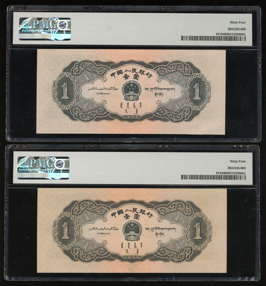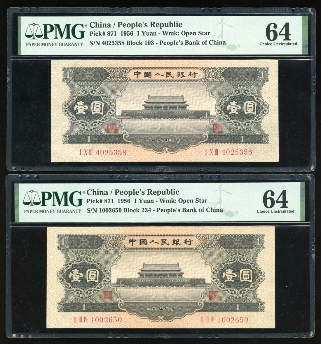 People's Bank of China, 2nd series renminbi, 1956, a pair of 1 yuan, serial numbers I X III 4025358 and II III IV 1002650, (Pick 871), both graded PMG 64 Choice Uncirculated (2).
