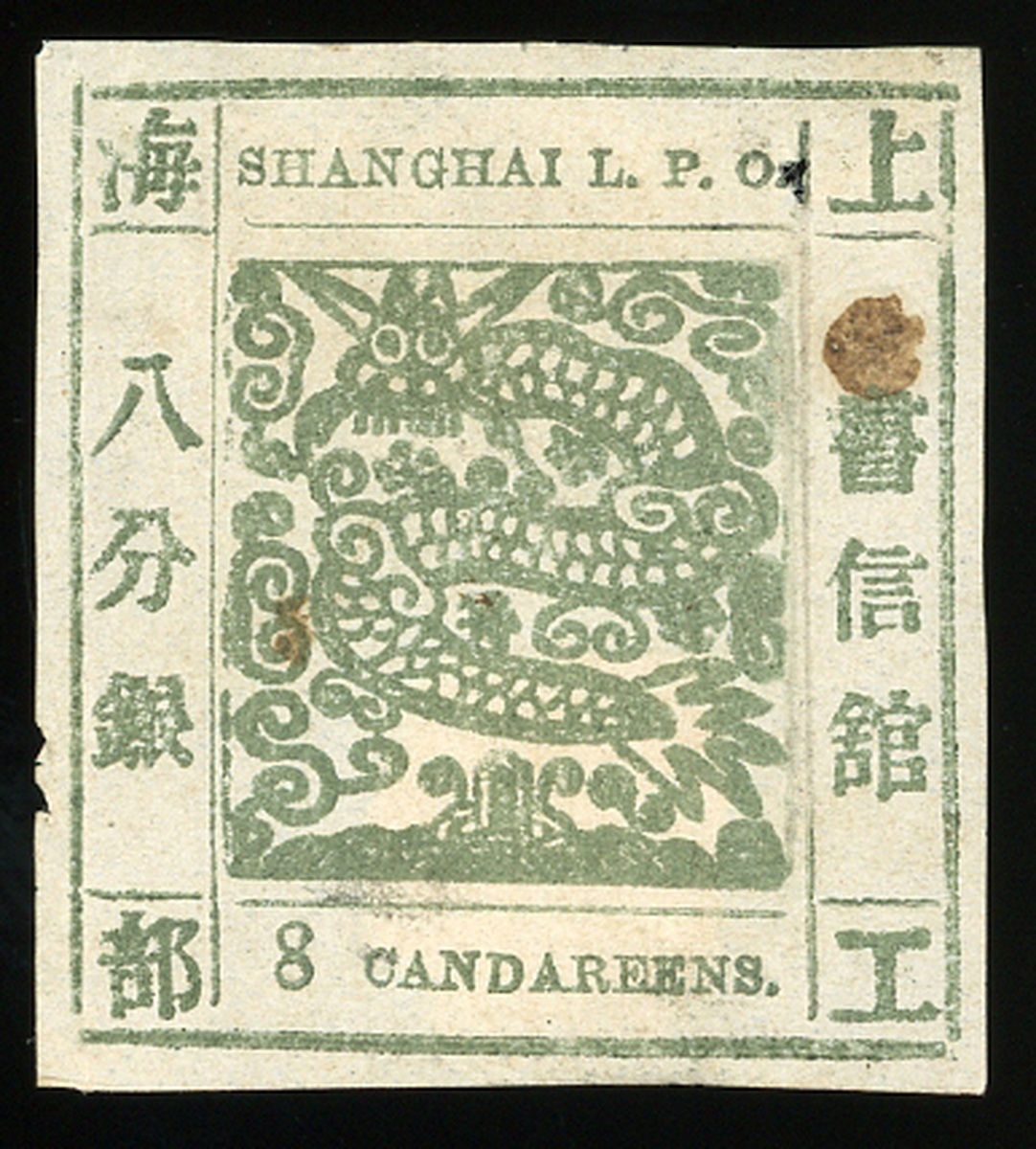 1866年上海工部大龍八分銀新票1枚,第59版式,票面顏色鮮豔,上中品