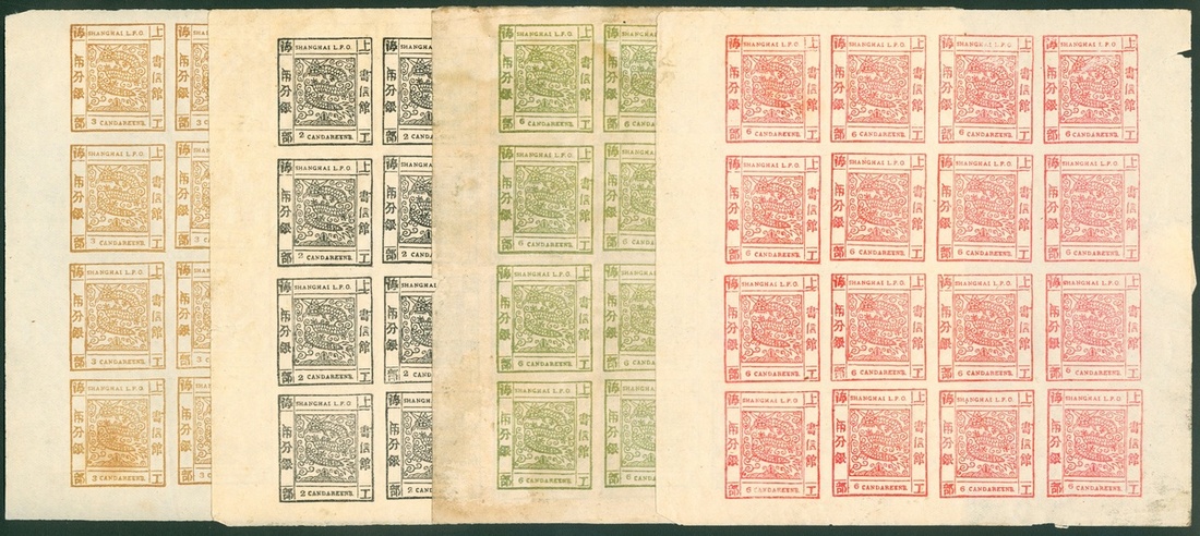 1865 Large Dragon issue 2ca. black, 3ca. brown, 6ca. green and 6ca. red, 4 kinds of forgery in sheet of sixteen, unused, good for reference.