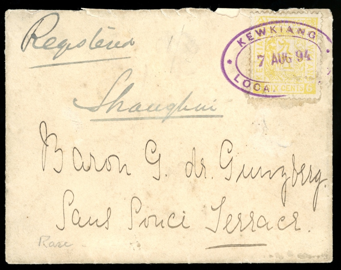 1894 (7 Aug.) envelope to Shanghai bearing 6c. cancelled by Kewkiang local post oval d.s., showing on reverse Shanghai Local Post double ring arrival c.d.s. (9.8), with wax seal.
