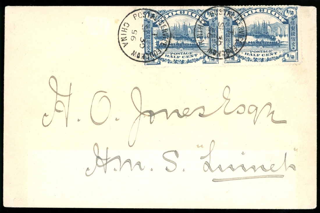 1895 (30 Sep.) local postage envelope bearing ½c. horizontal pair cancelled by "Postal Service Foochow/China" origin c.d.s., with inverted year character in d.s. variety, fine.