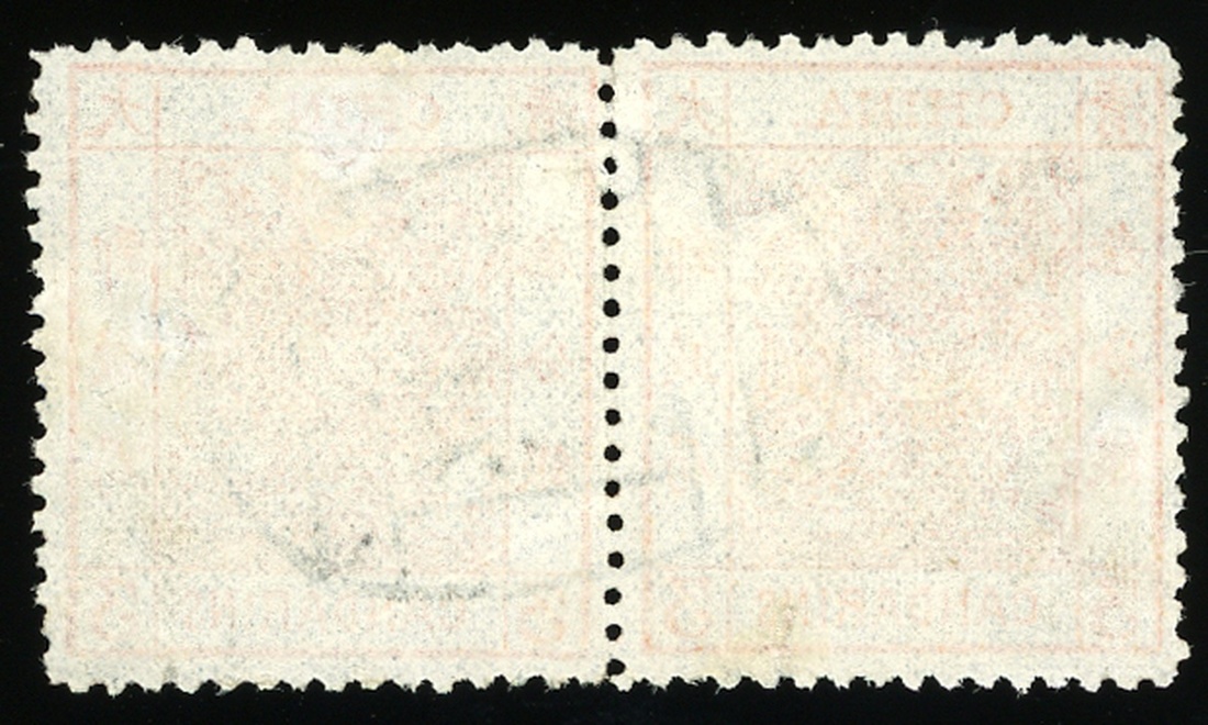 1878年海關薄紙大龍3分銀舊票橫雙連1件,銷天津中文戳,票面顏色鮮豔,齒孔完整,上中品