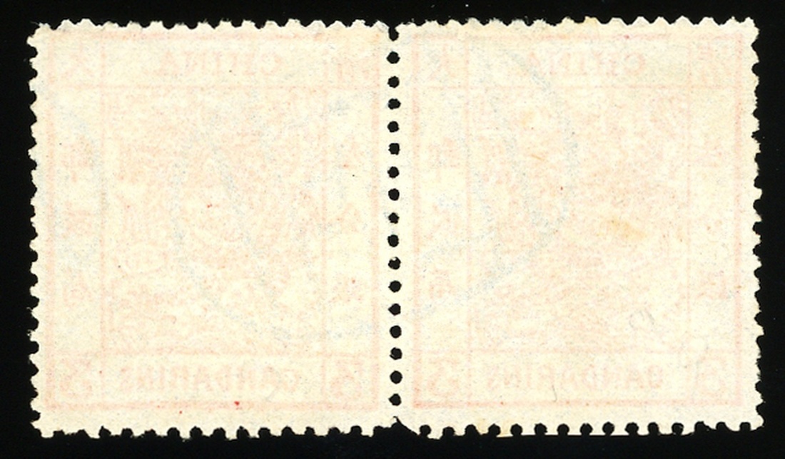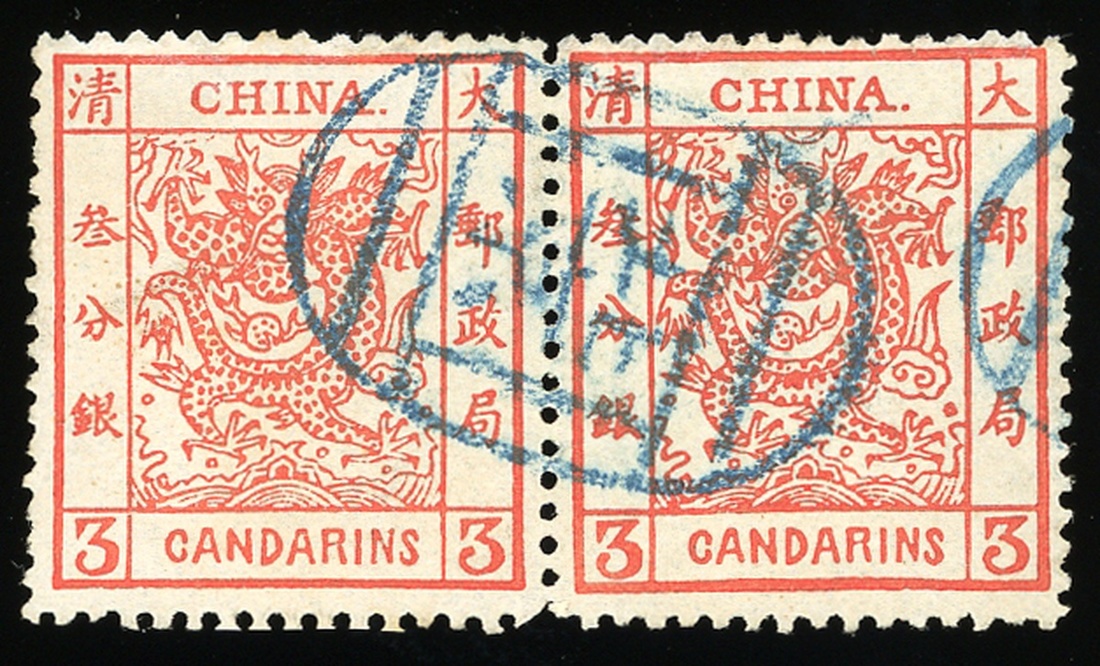 3ca. vermillion, horizontal pair, used with Peking seal cancelled in blue, very fine. Chan 2a