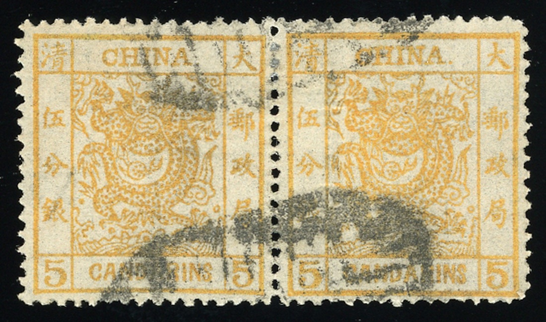 1878年海關薄紙大龍5分銀舊票橫雙連1件,票面顏色鮮豔,齒孔完整,上中品