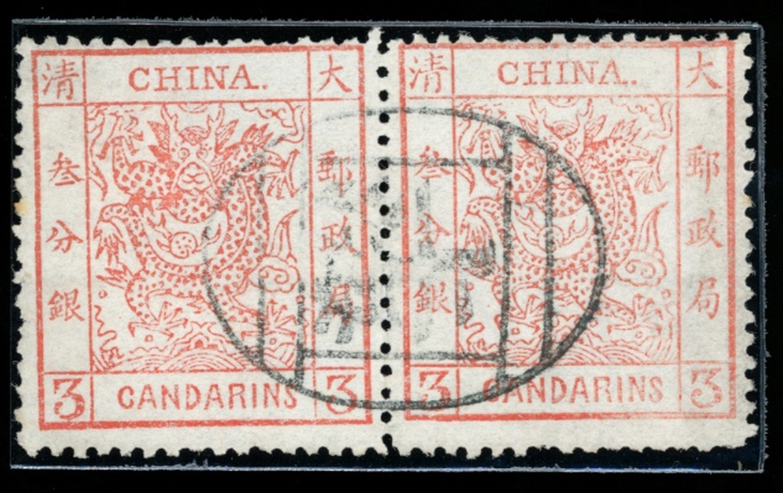 1883年海關厚紙大龍3分銀舊票橫雙連1件,銷上海中文全戳,票面顏色鮮豔,齒孔完整,上中品