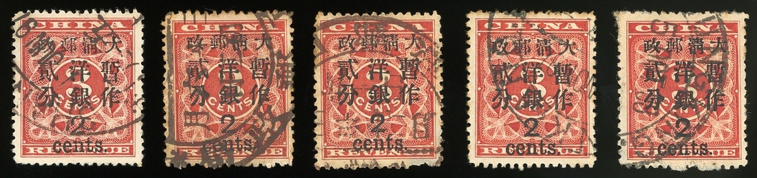 1897年紅印花加蓋大字暫作洋銀貳分舊票5枚,其中1枚輕微背薄,其餘票面顏色鮮豔,齒孔完整,上中品