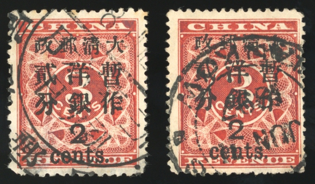 1897年紅印花加蓋大字暫作洋銀貳分舊票2枚,分別銷漢口海關日戳及漢口大圓戳,整體票面顏色鮮豔,齒孔完整,郵戳清晰,上中品