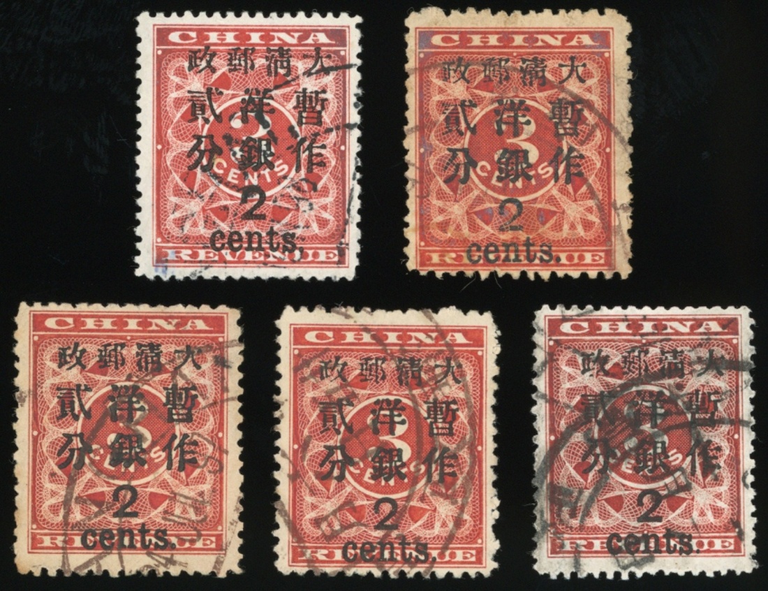 1897年紅印花加蓋大字暫作洋銀貳分舊票5枚,整體票面顏色鮮豔,齒孔完整,上中品
