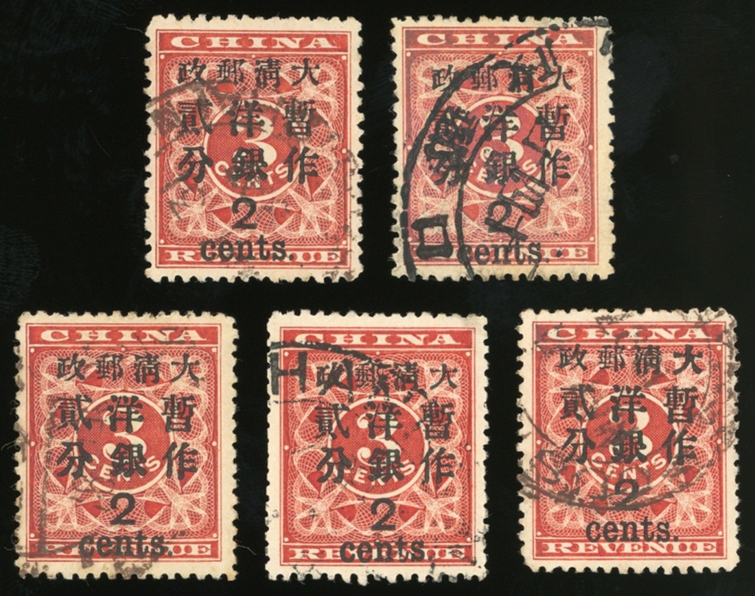 1897年紅印花加蓋大字暫作洋銀貳分舊票5枚,整體票面顏色鮮豔,齒孔完整,上中品