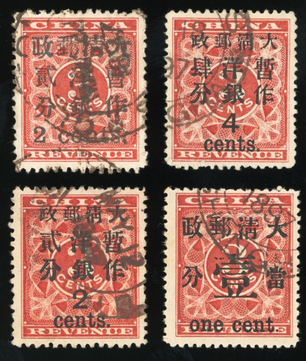 1897年紅印花加蓋舊票4枚,包括當壹分,小貳分,大貳分,大肆分各一枚,整體票面顏色鮮豔,齒孔完整,上中品