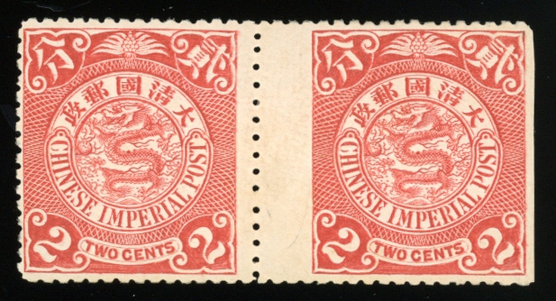 1901年倫敦版無水印蟠龍紅2分新票橫雙連1件,中間帶過橋,過橋處中縫漏齒,票面顏色鮮豔,翻膠無貼,上中品
