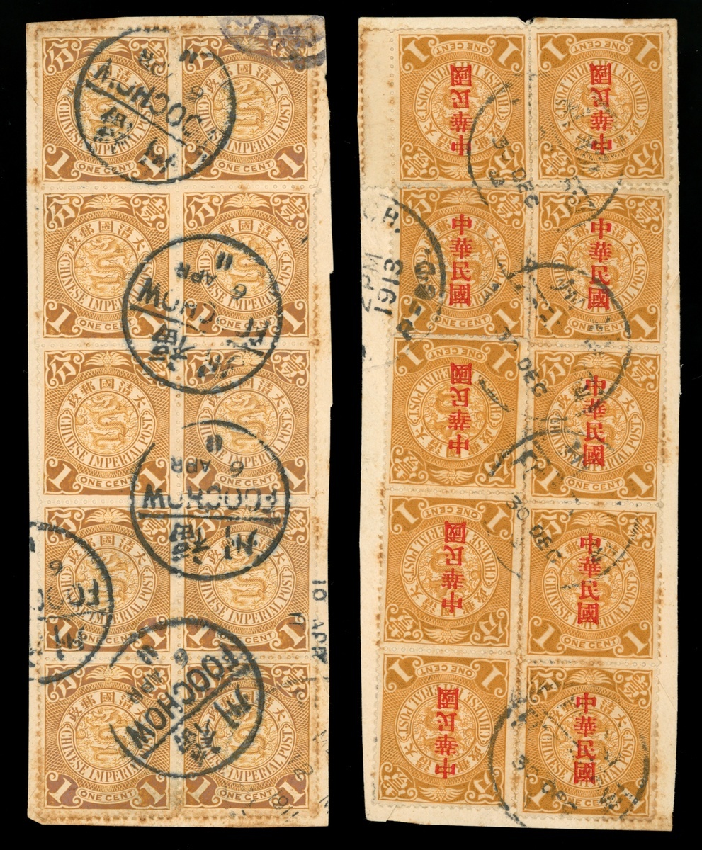 1911-1912 C.I.P. block of ten tied by 1911 (6 Apr.) Foochow bilingual c.d.s., and Statistical Department Overprints block of ten tied by 1912 (30 Dec.) Foochow bilingual c.d.s.