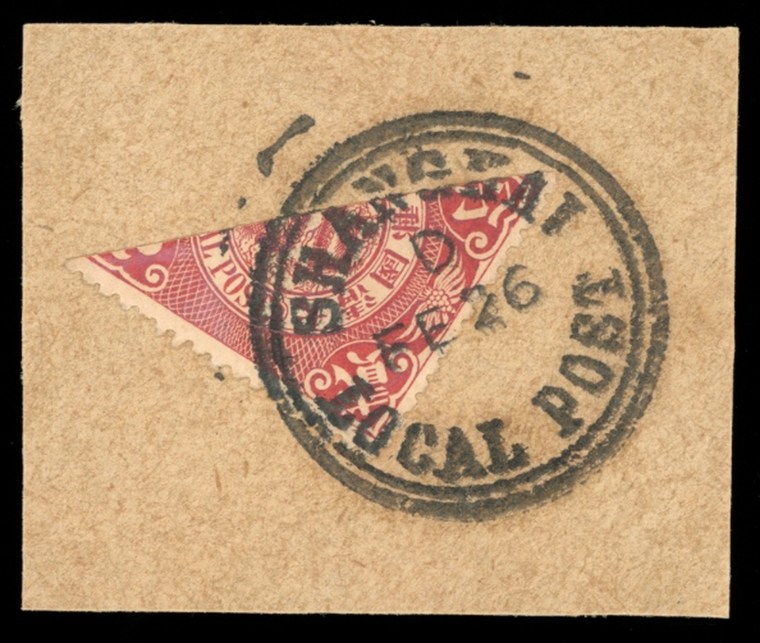 2c. scarlet bisect on piece tied by "Shanghai/Local Post" no year type c.d.s., fine.