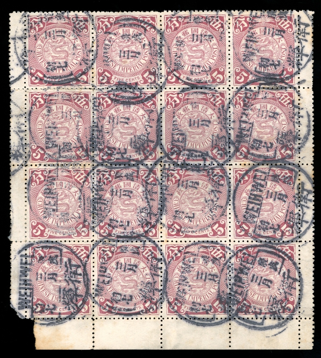 1902年倫敦版無水印蟠龍5分舊票十六方連1件,帶左右過橋及下邊紙,銷衛輝庚戌三月初七英漢腰框戳,郵票品佳,郵戳清晰,保存完好