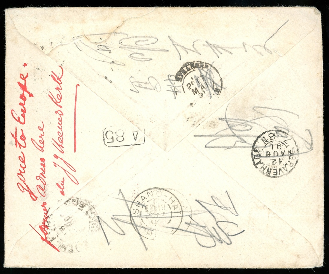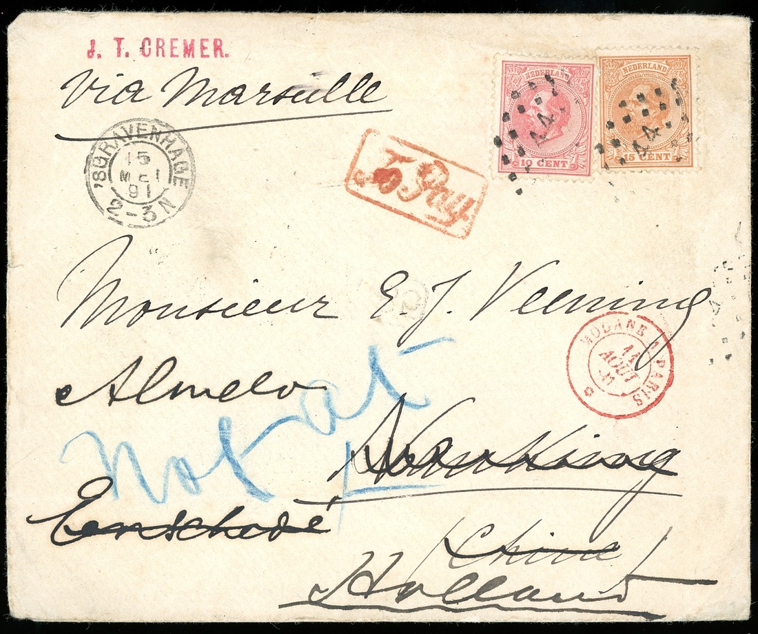 1891 (15 May) Incoming cover from Netherland to Nanking, China then returned to Holland (12.8), bearing Nederland 4c, and 10c. both cancelled by "44" seal ,showing origin c.d.s and "To pay" framed h.s. in red adjacent ,on reverse "Customs/Shanghai" double-ring d.s. (19.6) and Shanghai French post arrival c.d.s., Other cancellations include “A85” cancelled in Netherland, Holland transit c.d.s. and Paris transit c.d.s. (11.8) on return route. Rare use “TO PAY” to Nanking China