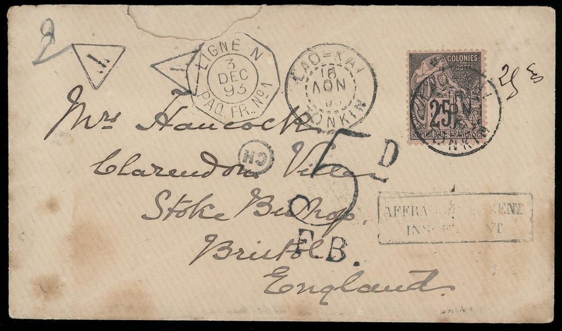 1893 (11 Nov.) envelope to Bristol, England (30.12) via Hanoi (23.11) and "Ligne N/Paq. Fr. No. 1" c.d.s (3.12), showing on reverse "Customs/Mengtzo" double-ring origin d.s. and bearing on front France Colonies General Issue 25c. cancelled by "Lao-Kai/Tonkin" c.d.s. (15.11), alongside showing "Affrancissement/Insuffisant" framed handstamp and triangle "T" postage due handstamp, 5d. unique Customs Mengtsz postage due cover, very rare.