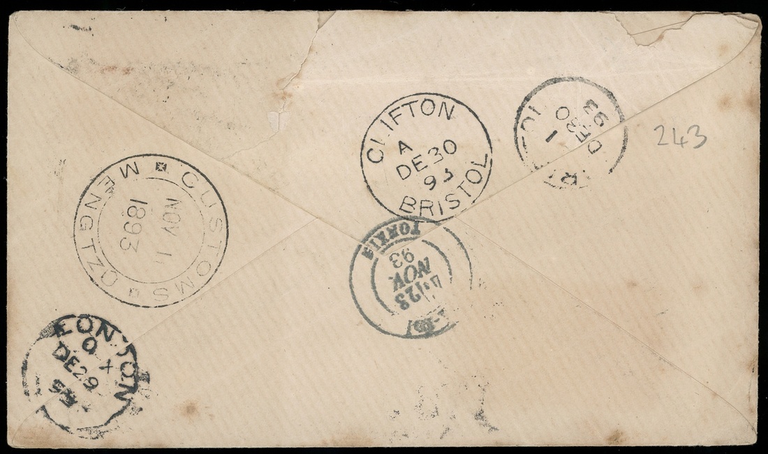 1893年雲南蒙自寄英國實寄封1件,正面貼法國票25分1枚,寄信人以現金方式繳納中國郵資,銷蒙自11月11日海關日戳,經東京老街,海防中轉,法國票銷老街16日戳,另有海防23日戳,法國輪船郵局12月3日戳,倫敦29日中轉戳,及克利夫頓到達戳,到英國後郵件因郵資不足作欠資處理,又蓋欠資戳,郵路清晰,保存完好,少見