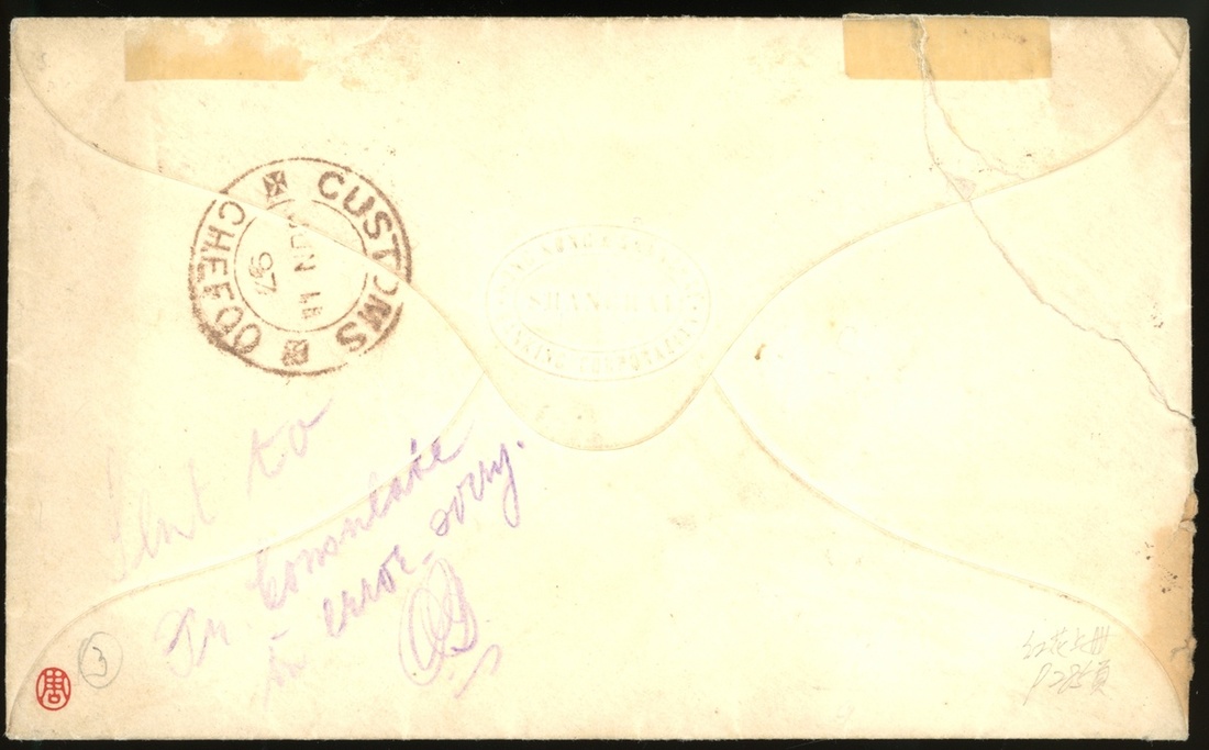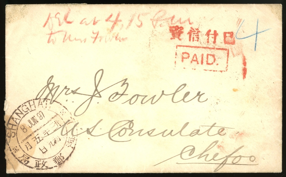 1897 (8 June) a stampless envelope to Chefoo, tied by PAID red frame chop and Shanghai Dollar Dater and Chefoo Customs c.d.s.