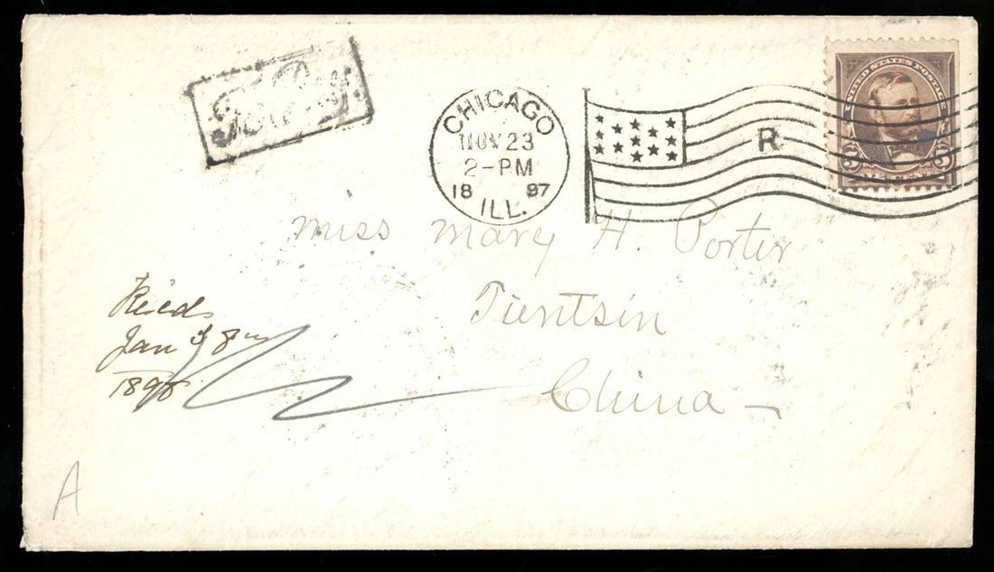 1897 (23 Nov.) Incoming mail from Chicago to Tientsin (1.1.98) bearing U.S.A. 5c. cancelled by machine c.d.s., "To Pay" framed h.s. adjacent, showing on reverse with "U.S. Postal Agency/Shanghai" c.d.s., San Francisco transit c.d.s., Shanghai transit dollar dater and "Tientsin" double-ring d.s. with "Customs" removed arrival c.d.s., fine