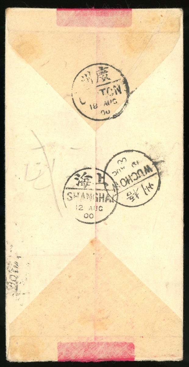 1900 (11 Aug.) a red band envelope to Wuchow, bearing 4c tied by Ningpo c.d.s. Wuchow 19.8.00 arrivial c.d.s.