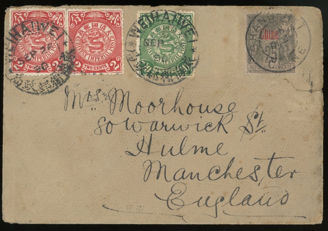 1900年威海衛寄英國實寄封1件,貼倫敦版蟠龍2分2枚,10分1枚,法國客郵25分1枚,蟠龍票銷威海衛郵政局9月26日中英文圓戳(年份誤置“90”),經上海中轉,有上海小圓戳,上海法國客郵銷10月8日戳,有英國11月10日到達戳,保存完好
