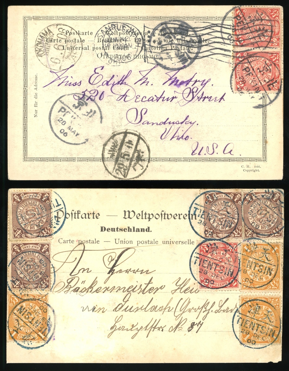 1900-06 picture postcards with Coiling Dragon stamps. Both sent to Europe.