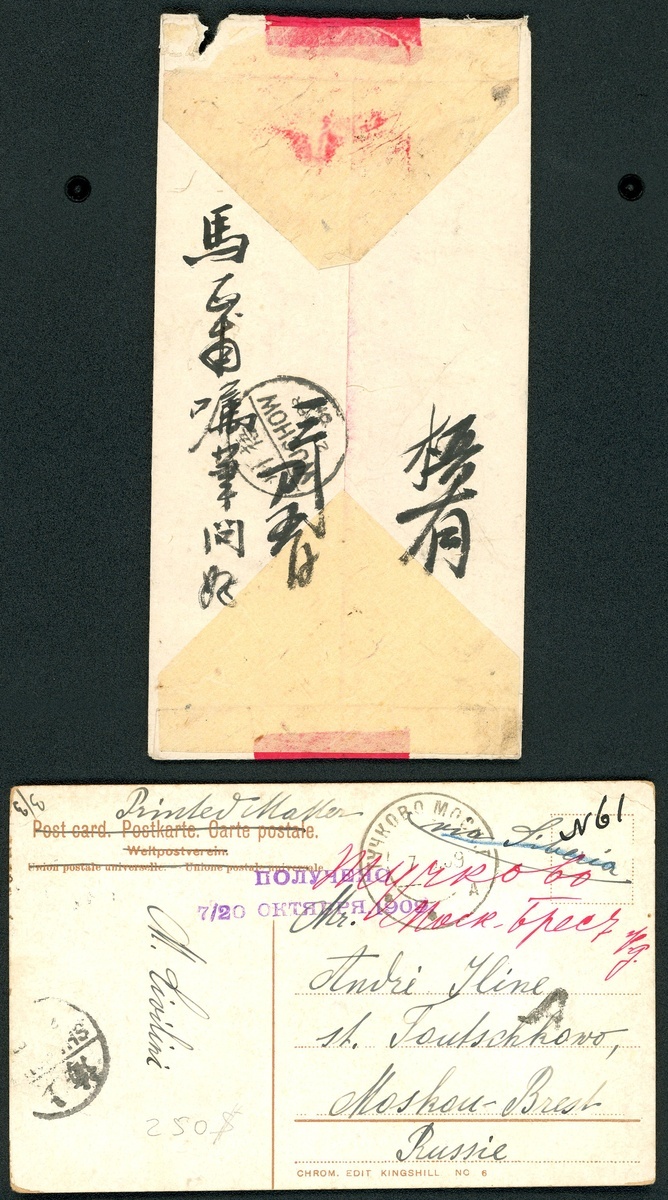 1901 (24 Apr.) red band cover to Wuchow bearing C.I.P. 2c. cancelled by Canton bilingual c.d.s. showing on reverse arrival c.d.s. (21.4); 1909 (19 Aug.) picture postcard to Russia bearing C.I.P. 2c. showing unclear Shanghai transit c.d.s and arrival c.d.s. , fine.