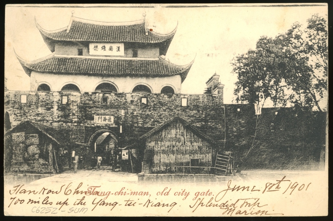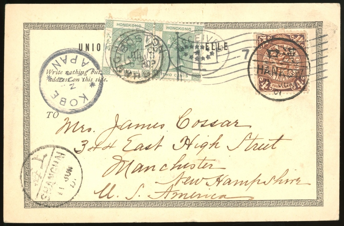 1901年漢口寄美國明信片1件,貼倫敦版蟠龍4分1枚,香港女王像2先2枚,蟠龍銷漢口6月8日小圓戳,經上海,日本橫濱中轉,有上海6月11日小圓戳,香港票銷上海6月11日英國客郵戳,另有日本橫濱中轉戳,及美國波士頓7月13日機蓋到達戳,明信片背為漢口通海門,郵路清晰,保存完好
