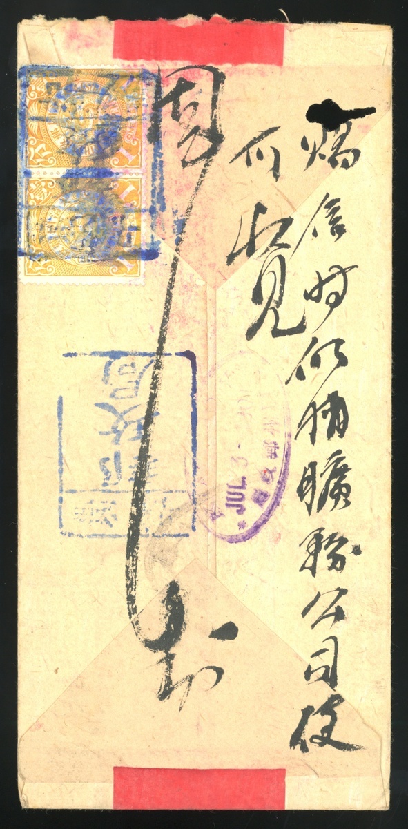 1901 (3 July) a red band envelope to Tsingtau, bearing 1c in pair, tied by Weishien tombstone in blue, Kiaochow3.7.01 oval arrival cancel.