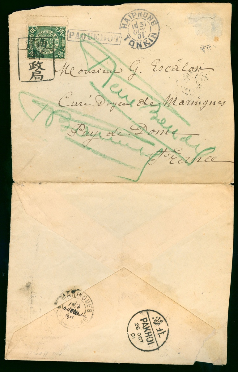1901 (26 Oct.) opened-out envelope to France bearing coiling dragon 10c. cancelled by Nanning tombstone handstamp, showing "PAQUEBOT" Haiphong (31.10) c.d.s., on reverse, fine Pakhoi (26.10) c.d.s., and France arrival c.d.s.(part of cancellation manual drawing).