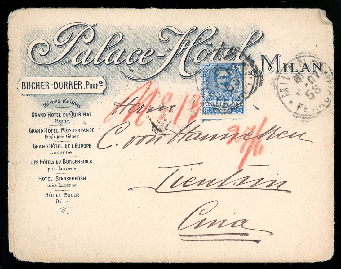 1902年意大利寄天津實寄封1件,貼意大利25分郵票1枚,銷10月21日戳,經香港中轉,有香港11月17日戳,另有天津11月26日小圓戳,及同日英國遠征軍駐天津軍郵到達戳,保存完好,收信人為漢納根,德璀琳之大女婿,北洋水師軍事顧問,李鴻章的左膀右臂,也是德皇威廉二世的親外甥,是清末中國著名的“洋大臣”