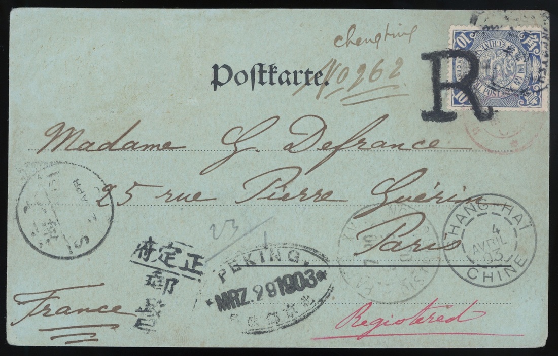 1903 (29 Mar.) a picture postcard registered to France, bearing 10c blue tied by Lunar c.d.s. and hand stamped large 'R', Zhengdingfu Tombstone alongside, France 20.7.03 arrival c.d.s.
