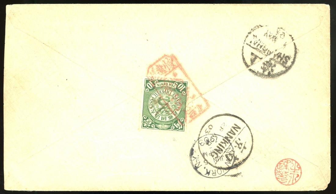 1903年懷遠寄美國實寄封1件,貼倫敦版蟠龍10分1枚,銷紅色懷遠縣郵政局碑型戳,經南京,上海中轉,有南京4月28日小圓戳,上海5月1日小圓戳,上海法國客郵局同日戳,及紐約6月5日到達戳,郵戳清晰,保存完好