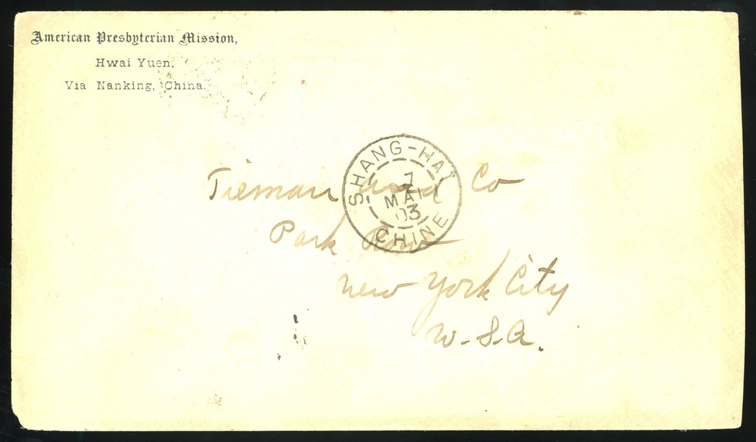 1903 (28 Apr.) an envelope to USA, bearing 10c green, tied by Hwai Yuen tombstone in red, New York 6.6.03 arrival c.d.s. fine.