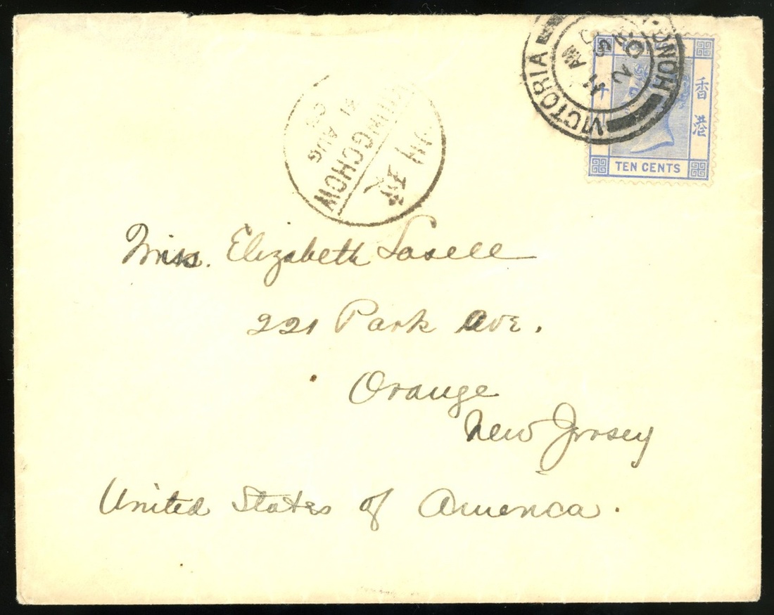 1903 (31 Aug.) envelope from Hainan to U.S.A. showing Kiungchow bilingual c.d.s. and bearing Hong Kong Q.V. 10c. tied by "Victoria/Hong Kong" c.d.s. (2.9), New York (11.10) arrived c.d.s., fine.