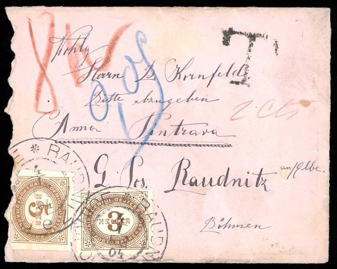 1903 (9 Dec.) envelope to Hungary (4.1.04) bearing on reverse C.I.P. 4c. (2) cancelled by Shanghai bilingual c.d.s., showing on front large unframed "T" h.s. in black matching postage due stamps applied on arrival cancelled by arrival c.d.s., roughly opened and edge damage.