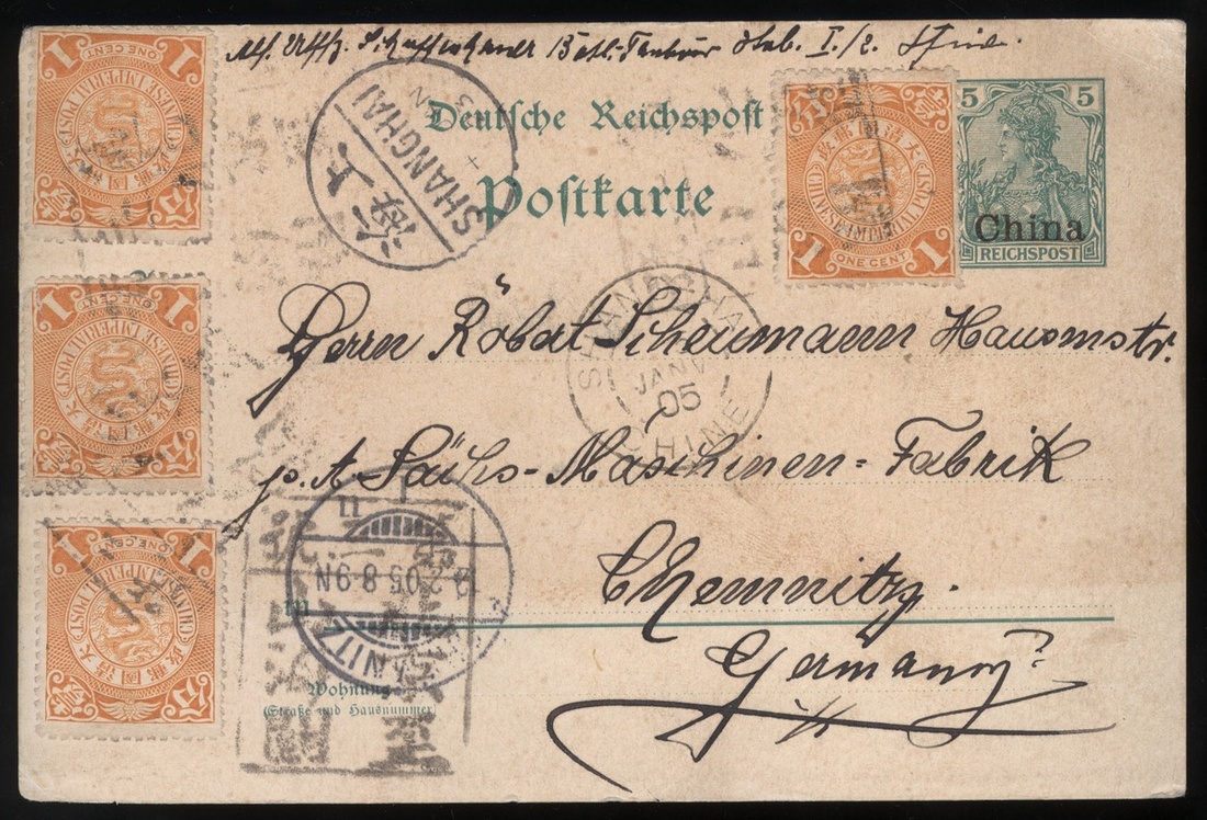 1904 5pf. stationery card overprint China to Chemnitz, Germany (2.2.05) bearing C.I.P. 1c. (4) cancelled by rectangular "No.3/Peking to Shanhaikwan" train post office h.s. in black, with Shanghai (4.1.05) and "Shanghai/Chine" (5.1.05) transit c.d.s. and arrival c.d.s. adjacent, fine.