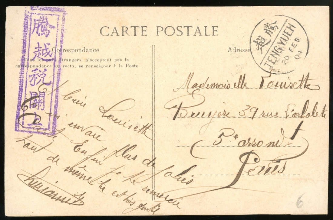 1904年雲南騰越寄法國巴黎明信片1件,貼倫敦版蟠龍4分1枚,銷騰越2月20日小圓戳,另蓋騰越稅關上戳,片背為雲南中藥舖,保存完好